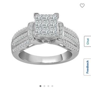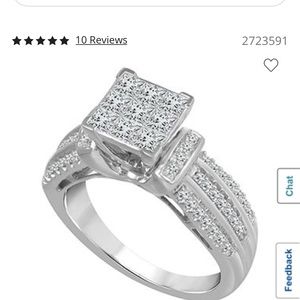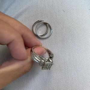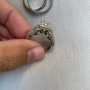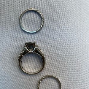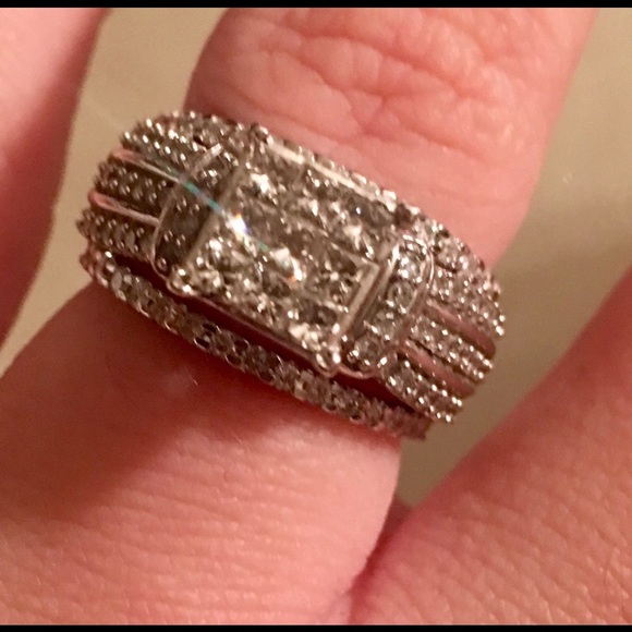 10K white gold bridal set. Bought new from JcPenney’s. Part of their Modern Bride collection. Center ring is 1 carat total weight. Each band is 1/2 carat total weight each. Whole set is 2 carat total weight. Very beautiful set. Size 7 on all three rings.