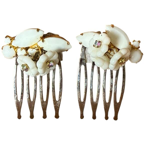 A graceful pair of white floral leaf hair combs created using vintage jewelry components and soft milky cabochons. Each comb features petal-shaped stones framed by textured gold leaves, offering an elegant touch that blends effortlessly into bridal and formal hairstyles.