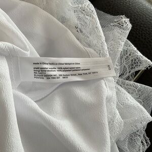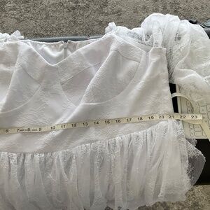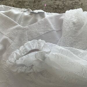 This is a beautiful bridal dress made by ELOQUII. It is tiered lace with a corset type top. It is a size 24 in women’s and is in very good condition. The beautiful lace sleeves make this a very romantic dress.