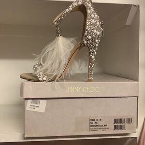 Jimmy choo Featuring an open toe, crystal embellishments, an ankle strap, a rear zip fastening, a brand embossed insole, a high stiletto heel w feather detail.