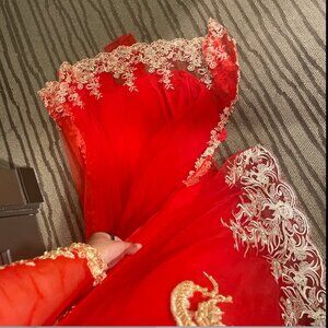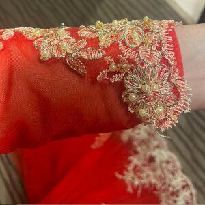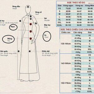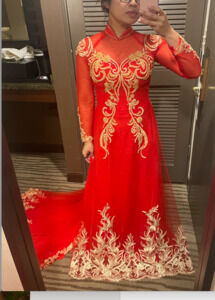 Bought in Vietnamese size large (I'm an American size small). Shop's original photo + shop's measurement posted. Close ups provided from actual dress. Also shows picture of me in the dress. Product quality and fit is as pictured! I decided to go with a different color for my wedding and unable to return. Comes with elastic waist red pants!
