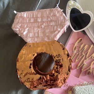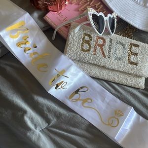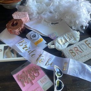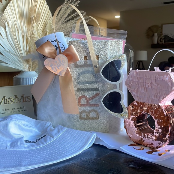Everything you need for your bride to be, comes with purse, boa, hat, sunglasses, cake topper, pin, sash, tiny piñata.sleep mask, drink holder, picture frame.