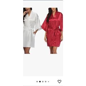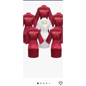 This Bride & Bridesmaid Robes Set includes 6 luxurious silver satin bath robes, perfect for a wedding or honeymoon. The high-rise, mid-thigh length robes feature a V-neck collar with a notch detail and a tie closure. Made of soft polyester fabric, these robes are machine washable and hand dry for easy care. The elegant solid pattern and imported design make them a beautiful addition to any bridal party, providing comfort and style for the women involved in the special occasion.