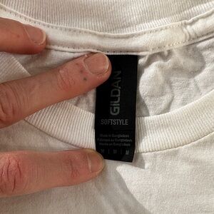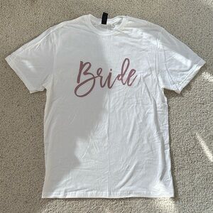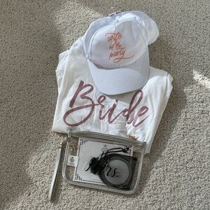 Classic white “Bride” T-shirt with tiny maybe makeup stain on collar, definitely washable. White “wife of the party” hat. Clear bridal wristlet with compact mirror. All useful on wedding day or a bachelorette weekend!