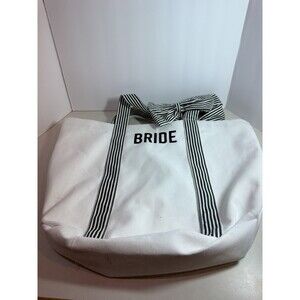 Bride Canvas Tote Bag White Black Striped Bow Handles Wedding Gift Preowned
