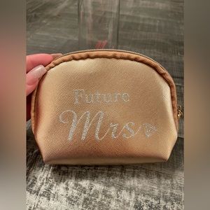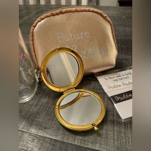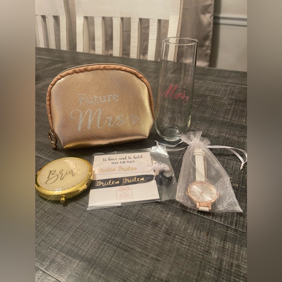 This bride gift bundle includes a Mrs champagne glass, a mini “future mrs” rose gold makeup bag, “best day ever” rose gold watch, bride hair ties & a gold bride mirror compact!
