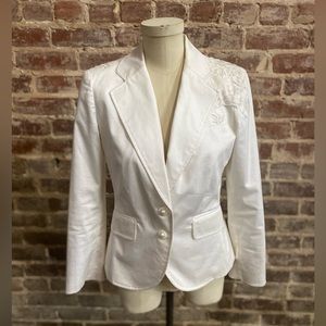Redesigned jacket. Added lace appliqué and faux pearl beads .