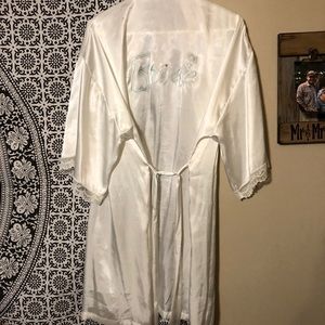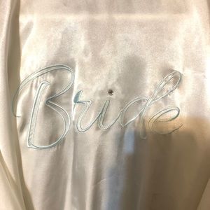 White bride robe, excellent condition! Friend bought it for me but it’s too small :( Size small. Word “bride” in blue with rhinestone in “i”