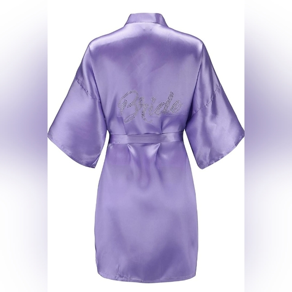 Short, light purple with rhinestones "bride" on the back robe. soft and smooth. one size fits most