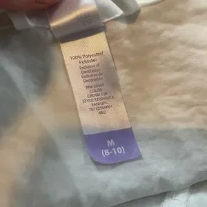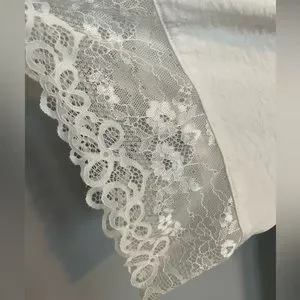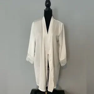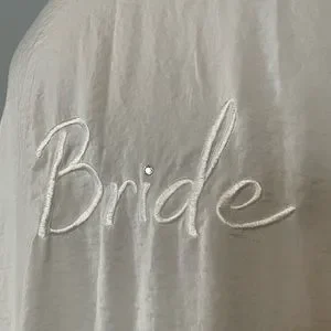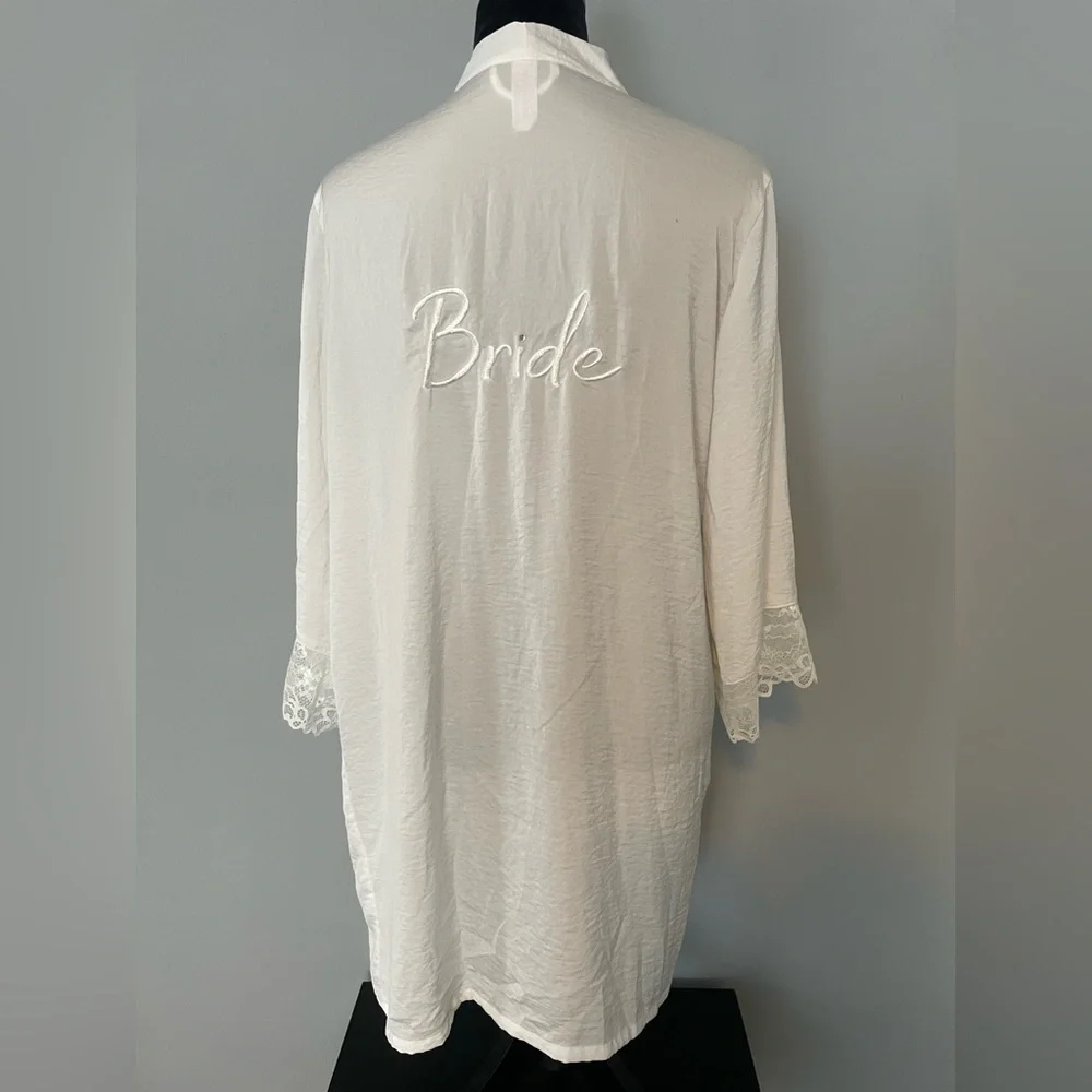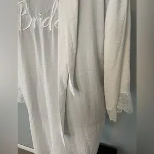 A cute bridal accessory. Medium length robe with belt (not attached, though there are belt loops to keep it in place!) and inner strings to tie shut. Perfect for getting ready the morning of your big day! Very photograph-worthy for while you’re doing hair and makeup, or hanging with your bridesmaids. Only worn for a couple of photos. Lacey sleeves and “Bride” embroidered on the back (with a little bling on the “i”!). Somewhat see-through, but not totally sheer (see on backside mannequin photo how you can see the tag/loop!). Note that the material is as-is in the photo, it’s not just wrinkly from storage, it’s got a texture to it.