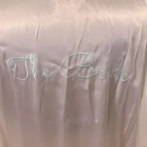 “The Bride” embroidered robe. Lace trim on sleeves and hem.