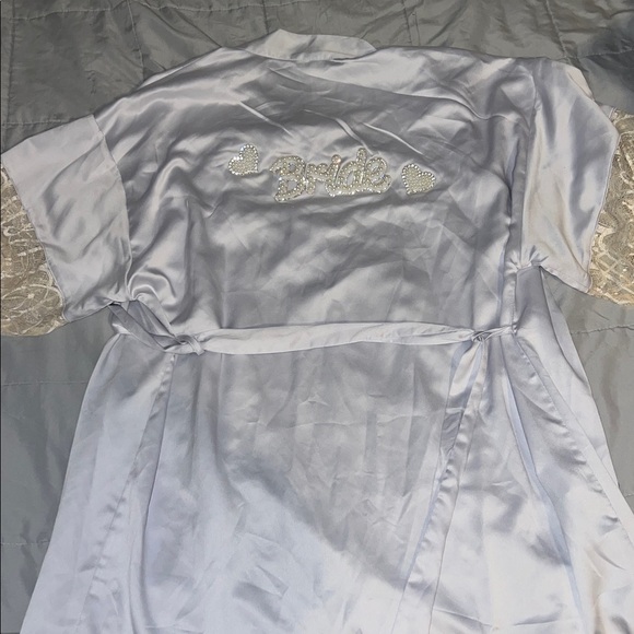 Bridal getting ready robe. Silky texture with lace on sleeves and bottom hem. Lavender and cream colored.
