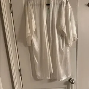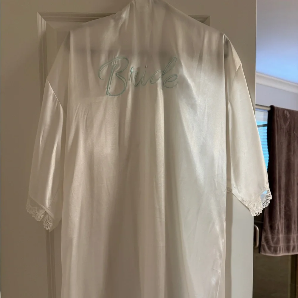 Satin bride robe with lace detail at the ends of the sleeves. Robe belt included. In like new condition. Only worn a few times. Perfect for getting ready on the big day!
