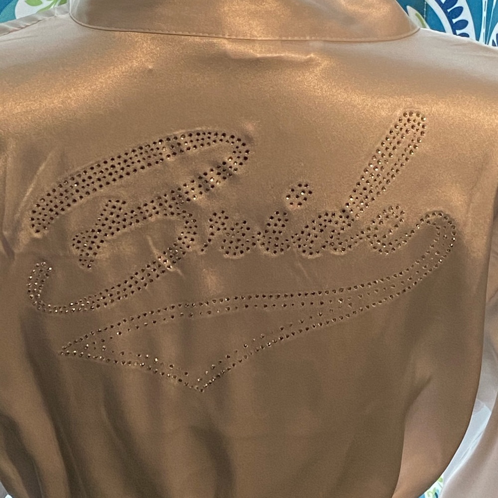 Bride robes are personalized on the back with the word Bride in rhinestone. Check out my Etsy Shop for all my listings: https://etsy.me/3bBq94j.