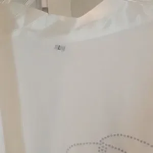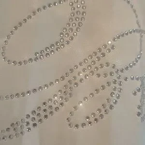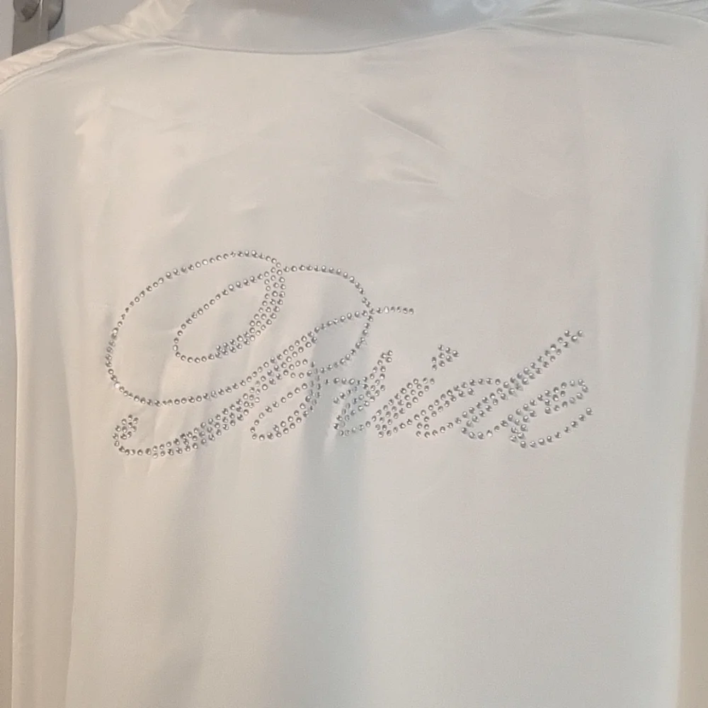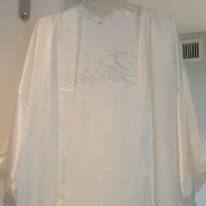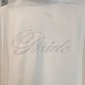 White soft silk robe with drawstring at waist perfect for pictures on your big day! BRIDE across back in silver rhinestones. Size L, brand unknown. Excellent condition, worm only one time for wedding day photos.
