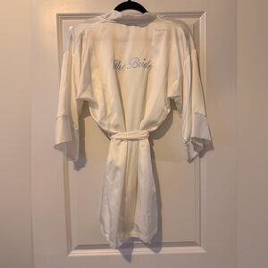 White satin robe with blue details (threading on sleeves and “the bride” embroidered on the back). Worn once - like-new condition. Not stains.