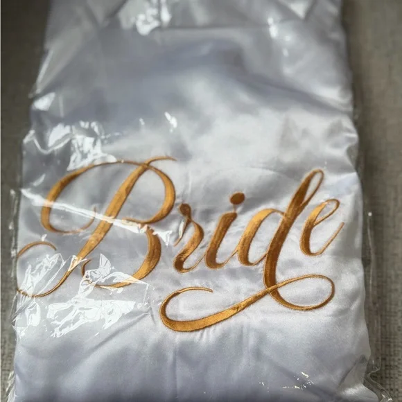 White satin robe featuring gold embroidered "Bride" script on front. Elegant bridal piece with shiny satin finish. Perfect for wedding morning photos and getting ready.