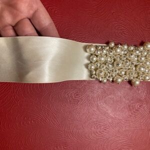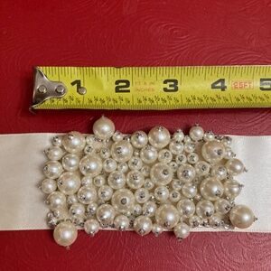 Purchased in a bridal boutique by Lian Carlo Couture. This wide 2” ribbon bracelet is just under 17” tip to tip. It is covered with lovely clusters of various sized pearls. The ribbon is a soft cream color. The ribbon may need to be steamed to smooth out any slight wrinkles.