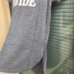 This “Bride” tee is high-low, thin and super comfortable. Great to pass along to the next person you know getting married! There are small slits on the sides to create a little movement. It’s a size medium but fits like a small.