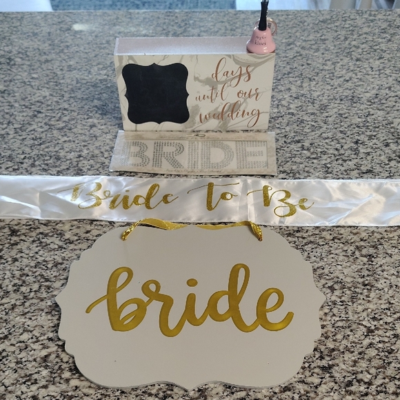 Sash- From Hobby lobby, hand wash only (white sash with gold glitter spelling "Bride to Be"). Hand wash only. Gently used.