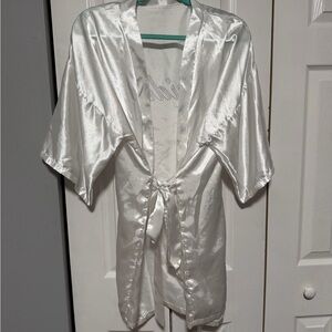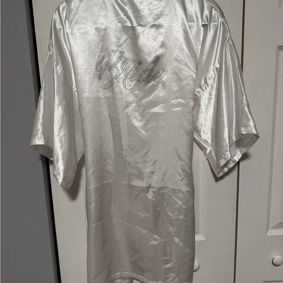 White satin robe with tie and diamond “Bride” on the back. Never used. One size but fits like an XL