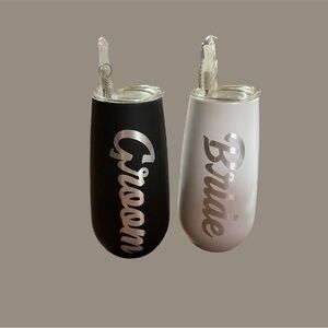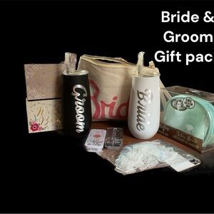 Celebrate with this Bride and Groom gift pack. Includes black and white tumblers, perfect for newlyweds. Includes bridal wedding day prep kit, bride and groom champagne flutes, bride big day makeup bag, bride and groom wishes box and bride and groom mints. You’ll be ready for your big day with these. See photos for description of contents in the big day prep kit.