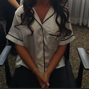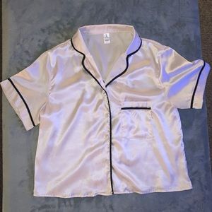 Bride button down with a silky satin feel. Worn once while I was getting ready before my wedding. Size is a large but it was listed as a crop. I usually wear a small so it fit me perfectly as a regular top.