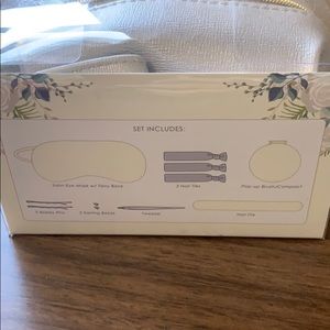 This mini bag has satin eye mask, 3 hair ties, pop-up brush/compact, 2 Bobby pins, 2 earring backs, tweezer and nail file