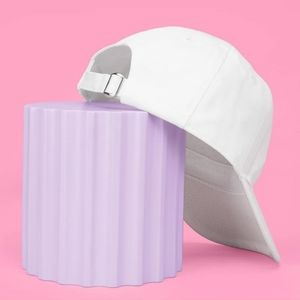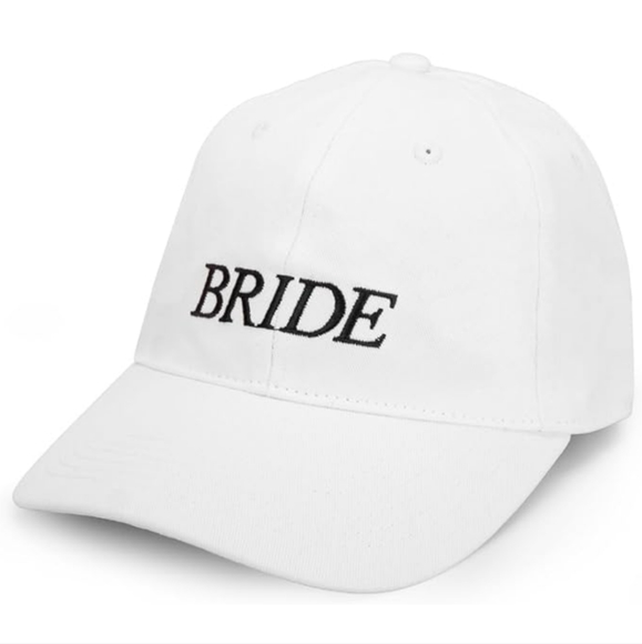 White "Bride" baseball hat with black embroidered lettering and adjustable back.