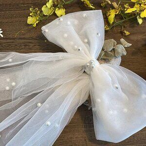 Hair clip is new and never been used. The soft tulle netting is dotted with pearl beads and tied into a sweet bow. The base is attached to a slim metal clip. Great for reception or bachelorette party wear.