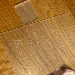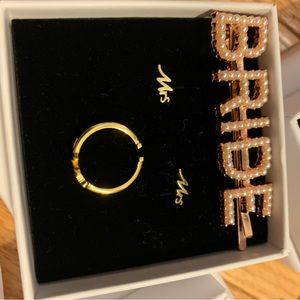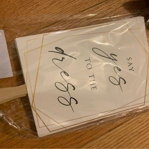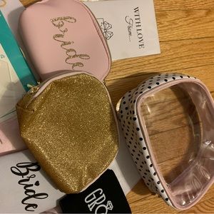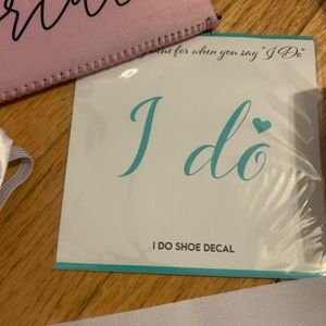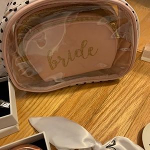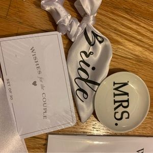 Bride-To-Be Bundle 👰🏻♀️🤍 includes two sashes: one pink sash that says bride to be in gold letters and one white sash that says bride to be in gold letters. White Bride koozie and black groom koozie. Clear cake topper that says “bride to be” in packaging. Brand new gray hat that says bride in white lettering. White satin scrunchie that has black lettering with “bride”. White face mask “bride” black letters. Ring holder “MRS.” Pink “bride” koozie. Brand new jewelry; silver “I Do” necklace, “bride” Bobby pin, “Mrs” earrings, “Mrs” adjustable ring, “Mrs” mirror. Wishes for the couple cards. Bachelorette Book. Say yes to the dress paddles. Three brand new makeup bags. Photo guestbook sign with stand. “Bride to be” veil.