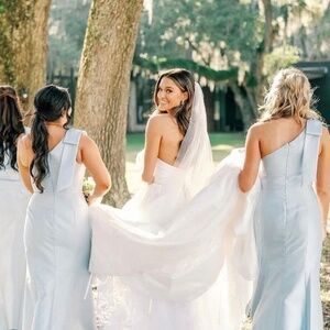 Light Blue One Shoulder Satin Sheath Long Bridesmaid Dresses From Kiss Prom. Never worn.