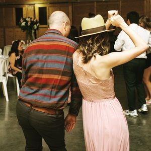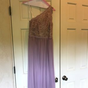 Beautiful dress that was worn one night for a wedding. One shoulder and a fun side slit. It is not my color so I don’t need it anymore. It was hemmed to fit me and I’m 5’4”. Color is Rose Gold Metallic. It is currently listed here: https://www.davidsbridal.com/Product_long-one-shoulder-lace-bridesmaid-dress-f17063
