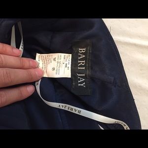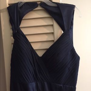 Long navy dress. Showing back with diamond shape. Very flattering. Fit for 100-140 lbs Hemed for 5'2 with heels