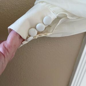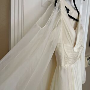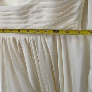 My daughter bought to wear after the wedding at the reception. She ended up staying in her wedding dress the entire night. This is a gorgeous Bridess ivory sheer but substantial dress. Long and flowing. Scalloped type design on the bottom. Sheer sleeves with a slit open design towards the shoulders. She was going to keep it for a formal dress to possibly wear on a cruise or? But she’s expecting this summer so doesn’t suspect she will! Would be a beautiful beach wedding dress!