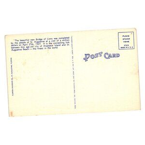 Vintage postcard featuring the Bridge of Lions across Matanzas Bay in St. Augustine, Florida. Linen print by Tichnor Bros, highlighting America’s oldest city in vibrant colors.