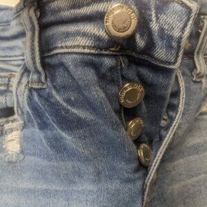 Cute exterior button fly, lots of distress on pockets and ankles, and super high rise. These jeans are sold exclusively at Buckle, and aside from what's purposefully NOT, they're in excellent condition!
