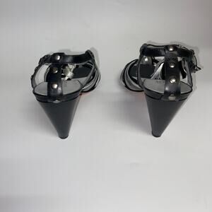 Bridget Shuster Black Silver Gray Leather Tassel Tie Ankle Strap Heeled Sandals Women's Size 7.5