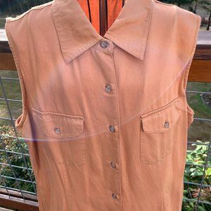 This is a well made and comfortable dress that is in Excellent pre-owned condition. Made of 65% rayon and 35% cotton with no stretch. It has no sleeves with a collared neckline. Buttons up the front and has 10.5" side slits. There are 2 flap pockets on chest with button closures. Great dress to wear for casual events, weddings, out shopping, traveling or to any lunch or dinner date.