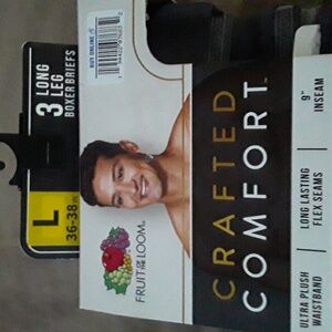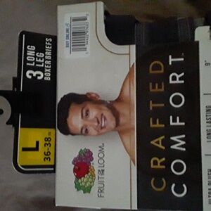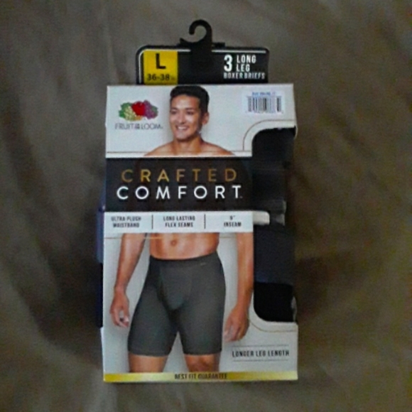 long leg briefs. package seem to been open a little to look at but all 3 brief are new. fruit of loom crafted comfort longer leg briefs. size L 36 to 38. 3 pak.