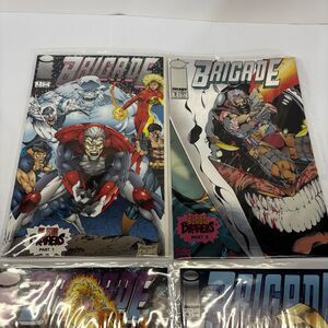 A set of four vintage comic books from Image Comics, specifically Brigade #1 to 4 from 1993. The series falls under the Modern Age era and is suited for a general audience. The comic books feature action, adventure, and colorful illustrations, making them a collectible item for fans of comics and graphic novels. All comics will be bagged and boarded before shipping.