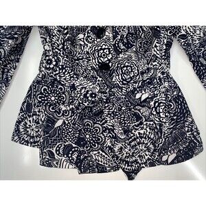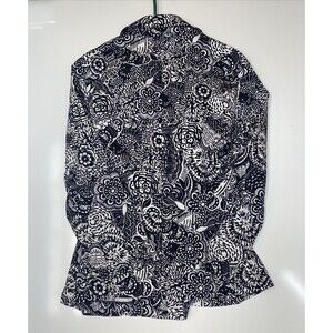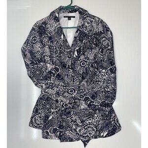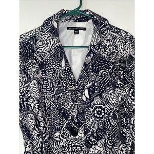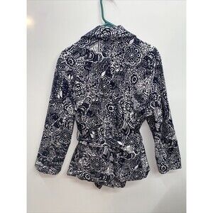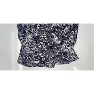 Briggs New York Womens black and white floral button up jacket with belt size 18, super cute floral jacket with built in belt perfect for any occasion. Some wear but no big damages has a small spot on collar ( pictured). But no holes, snags, or rips anywhere. Buttons are in perfect condition still as is the belt and belt loops. Measurements are included in photos.