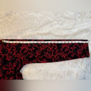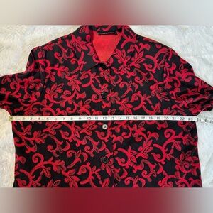 This chic black jacket features a stunning red antique scroll print, making it perfect for layering or wearing buttoned up as a polished top. Whether you're heading to the office or a casual outing, this classic piece is versatile enough to suit any occasion.