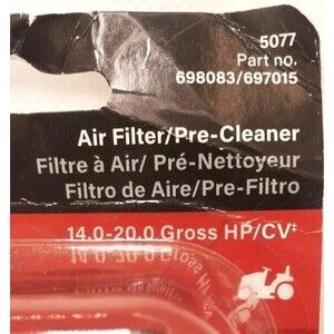 This Briggs & Stratton air filter and pre-cleaner is the perfect addition to your lawn mower. 5077 model part no. 698083/697015 this part has a power source of gas and a horsepower of 14 HP-20hp The item measures 2 inches in height, 9 inches in length, and 3 inches in width, with a weight of 4oz. The air filter is made of plastic and pressed paper comes in a sleek black color.