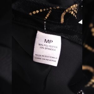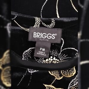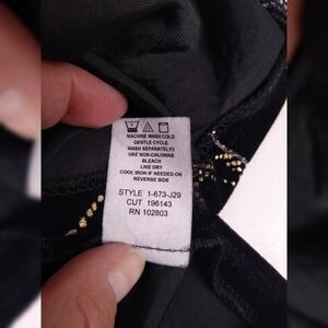 Black velvet top with a gold and silver glitter floral pattern throughout the top.