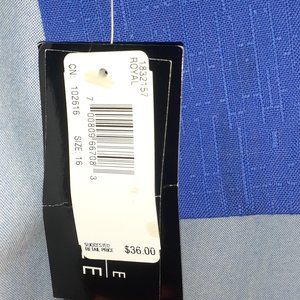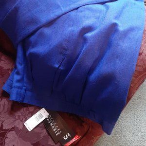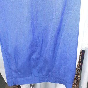 Brand new, never worn, still has tags, pleated slightly in front, some elastic in back. Inseam is 28", beautiful rich blue. Waist measures 35", front button and zipper. Belt loops and machine washable.