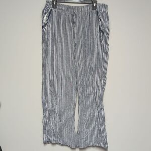 cute white and blue wide leg pants. front pockets. elastic waist