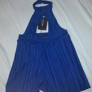 Look stylish and chic in this bright blue plisse romper with a high neckline and an open back. Perfect for women who love to flaunt their personality, this one-piece is a must-have in your wardrobe. The romper features an open design that adds an element of playfulness, making it perfect for a day out with friends or a night out on the town.