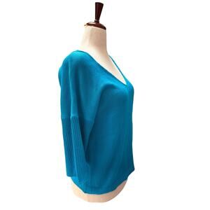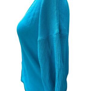 Vibrant cobalt blue textured knit top in size Small. Features a flattering V-neckline, relaxed fit, and elbow-length sleeves for easy wear. Soft knit offers comfort while keeping its shape. Good pre-owned condition.