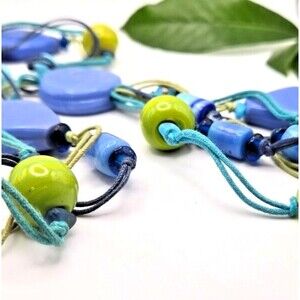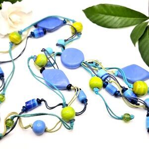 Bright Blue and Green 27" Long Ceramic and Glass Beaded Y-Drop Cord Necklace